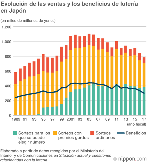En 2005, la venta de lotería alcanzó su máximo —cerca de 1 billón 105 mil millones de yenes—; desde entonces, ha ido cayendo gradualmente. En 2011, año en que ocurrió el Gran Terremoto del Este de Japón, el sorteo de marzo, que se publicitó como parte de la ayuda a la reconstrucción, tuvo una buena acogida. Además, se aumentó la cantidad de sorteos para los que es posible elegir el número con el que participar. Sin embargo, en el ejercicio fiscal posterior, la tendencia volvió a descender. En el año fiscal 2017, la caída fue del 6,9 % respecto del período anterior (788.600 millones). Hacía dos décadas que las ventas no se situaban en la franja de los 700.000 millones. Por primera vez en cuatro años, la venta de lotería para sorteos cuyo número de participación se podía elegir —el nuevo producto— aumentó un 2,6 % (379.900 millones), pero la de décimos o boletos con acceso a premios de gran cuantía cayó un 13,1 % (325.600 millones). En comparación con 2015, el descenso del segundo fue de hasta cien mil millones, lo que repercutió en la caída de la venta total.