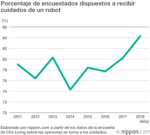 Los robots podrían ser de ayuda para aliviar la escasez crónica de mano de obra en un Japón que envejece. Un estudio realizado por una empresa de cuidados para personas de la tercera edad situada en Tokio revela que más del 80 % de los encuestados mostraron una actitud positiva hacia el uso de robots como cuidadores.