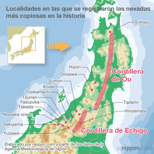El norte de Japón es otra de tantas regiones del mundo que registran intensas nevadas durante el invierno. Si observamos geográficamente los datos históricos sobre las nevadas recogidos por la Agencia Meteorológica de Japón, veremos que es en el área interior de la costa del mar del Japón donde se concentra la mayor parte de los lugares más nevados.