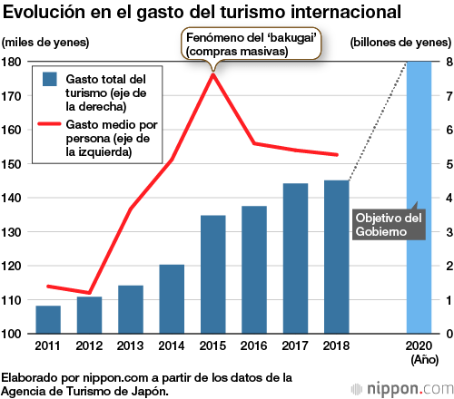 En 2018 los turistas internacionales que llegaron a Japón gastaron 4,5 billones de yenes, la cifra más alta registrada en la historia. No obstante, esto supone solo un avance del 56 % respecto a la meta de 8 billones de yenes que el Gobierno se ha marcado para 2020. El gasto medio por turista internacional, por otra parte, fue de 152.594 yenes. En 2015, año en el que se habló mucho del bakugai (las compras masivas) del turismo chino, el gasto por persona alcanzó los 176.000 yenes. Sin embargo, este ha experimentado una reducción en los últimos tres años consecutivos desde que el fenómeno comenzase a remitir.