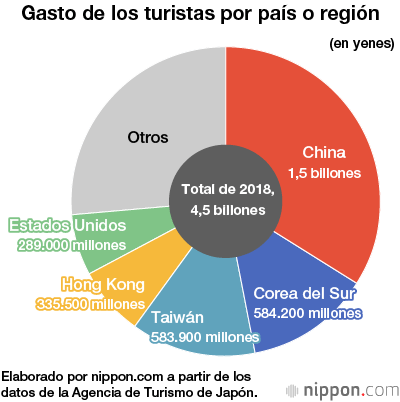 Por países y regiones de procedencia, los turistas chinos fueron los que más gastaron en el cómputo global (un tercio del total) con 1,5 billones de yenes, seguidos de los surcoreanos, los taiwaneses y los procedentes de Hong Kong. El 67 % del total del gasto fue realizado por cuatro países de Asia Oriental. En cuanto a los turistas procedentes de otras regiones, el volumen del gasto de los estadounidenses también fue notable.