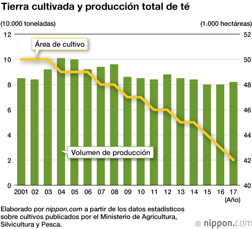 La extensión de tierra cultivable dedicada al té en Japón ha disminuido, pero el volumen de producción de té se ha mantenido en torno a las 80.000 toneladas al año. Las empresas de bebidas dependen de hojas de té de menor calidad para preparar el té en botella, reduciéndose así la demanda de hojas de mayor calidad cosechadas al comienzo del período vegetativo. En su lugar, los cultivadores han hecho frente a una creciente demanda de variedades más baratas aumentando de forma progresiva la recogida de hojas que brotan más tarde en la misma planta.