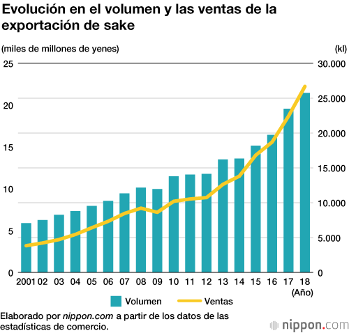 La popularidad del nihonshu, el sake japonés, ha venido en aumento al mismo tiempo que ha crecido el interés global por la gastronomía nipona. Las cifras de exportaciones anuales han registrado un récord histórico cada año desde 2010. En 2018 las ventas internacionales alcanzaron los 22.200 millones de yenes, superando la cifra de los 20.000 millones por primera vez. El volumen de exportaciones también alcanzó una nueva cima el pasado año, con 25.700 kilolitros (14 millones de botellas de 1,8 litros aproximadamente).