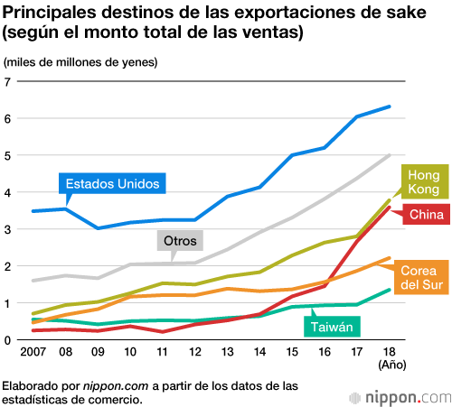 Por países, Estados Unidos fue el principal destino de las exportaciones de sake representando cerca del 30 % del total y unos 6.313 millones de yenes en ventas. Le siguieron Hong Kong, China, Corea del Sur y Taiwán. Entre estos mercados asiáticos, las ventas en China han aumentado considerablemente desde 2014 hasta el punto de que este país está cerca de superar a Hong Kong como segundo mayor mercado. Un factor que podría estar contribuyendo a este notable incremento es la influencia del turismo chino que llega a Japón, que representó el 27 % del total de los 30 millones de visitantes internacionales en 2018. Muchos de ellos muestran interés por la gastronomía japonesa tras viajar por el país.