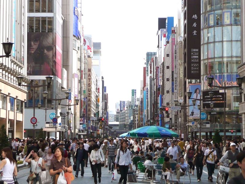 Los fines de semana, cuando la calle queda libre de tráfico, Ginza se llena de personas que acuden a disfrutar del espectáculo que ofrecen los numerosos escaparates. Además, gracias al creciente número de turistas extranjeros que acuden últimamente, cada vez más establecimientos del lugar ofrecen sus servicios en varios idiomas.