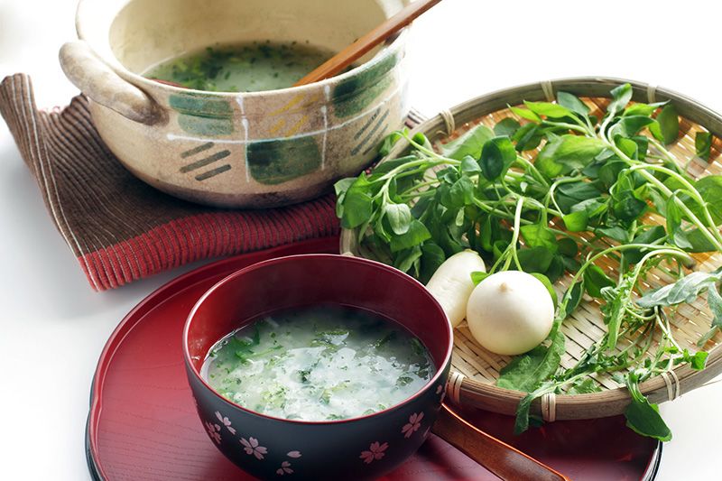 El 7 de enero es costumbre comer nanakusagayu, unas gachas o arroz congee con siete tipos diferentes de verduras. Es un plato que en cierto sentido regenera el cuerpo tras los atracones de Año Nuevo y es suave para el estómago, cansado del alcohol que acompaña las celebraciones de Fin de Año y Año Nuevo. Además, lleva verduras, un ingrediente que escasea en los platos típicos de esta época.