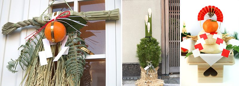 A la izquierda, shimekazari; en el centro, kadomatsu. A la derecha, kagamimochi.