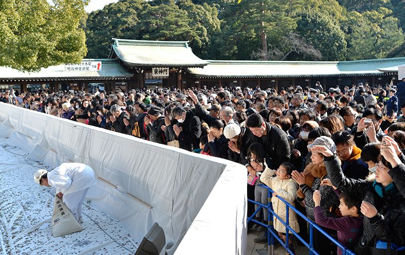 El Año Nuevo es la celebración más importante en Japón y, como tal, está repleto de actos tradicionales y costumbres. La primera visita del año a un santuario sintoísta o templo budista, el hatsumōde, es una de las prácticas imprescindibles. El objetivo de este tipo de peregrinación es mostrar agradecimiento a los dioses y rezar por que la buena suerte y la paz reinen durante los próximos doce meses. Para ello, se lanza una moneda a un cajón de madera que hace las veces de hucha y se juntan las palmas de las manos. Además, es frecuente consultar una especie de oráculo que ofrece sus mensajes por escrito, los omikuji, y comprar amuletos o tablillas ema; en estas últimas la gente plasma sus deseos y peticiones con la esperanza de que los dioses intercedan. El santuario Meiji y los templos Naritasan Shinshō y Kawasaki Daishi son los tres lugares santos que más visitantes reciben – más de tres millones–, del 1 al 3 de enero.