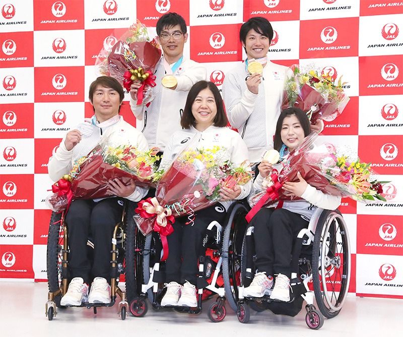 Los medallistas del equipo paralímpico japonés y la jefa de la delegación fotografiados después de su regreso en el Aeropuerto de Narita el 19 de marzo de 2018. En el sentido de las agujas del reloj desde la izquierda en la parte superior: el esquiador de fondo Nitta Yoshihiro, el patinador de snowboard Narita Gurimu, la esquiadora alpina Muraoka Momoka, la jefa de la delegación Obinata Kuniko y el esquiador alpino Morii Taiki. (© Jiji)