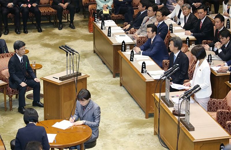 Sagawa Nobuhisa (a la izquierda) responde a las preguntas de Marukawa Tamayo, del PLD (a la derecha, en el primer plano) el 27 de marzo de 2018 en la Dieta. (© Jiji)