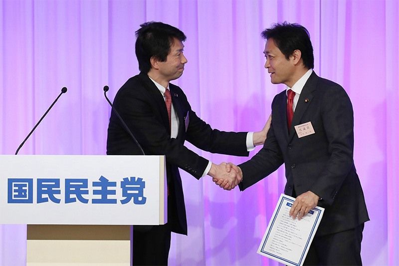 Los líderes conjuntos Ōtsuka Kōhei (a la izquierda) y Tamaki Yūichirō (a la derecha) se estrechan la mano después de la primera reunión del Partido Democrático del Pueblo celebrada el 7 de mayo de 2018 en Tokio. (© Jiji)
