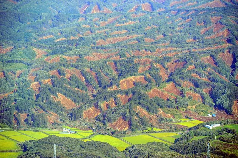 Una amplia zona de colinas quedó destrozada por los corrimientos de tierra. Esta imagen aérea fue tomada en Atsuma, Hokkaidō, el 6 de septiembre de 2018. (© Jiji)