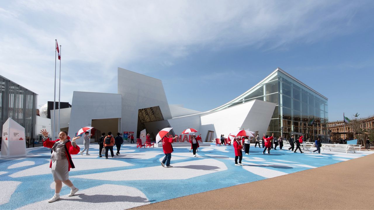 El tema de este pabellón es la “regeneración”. El azul y el blanco del exterior representan la descongelación de un río helado al comienzo de la primavera. Los visitantes son invitados a pasear junto al río mientras observan la vida local y experimentan la calidez y positividad de Canadá a través de la realidad aumentada en una tableta especial.