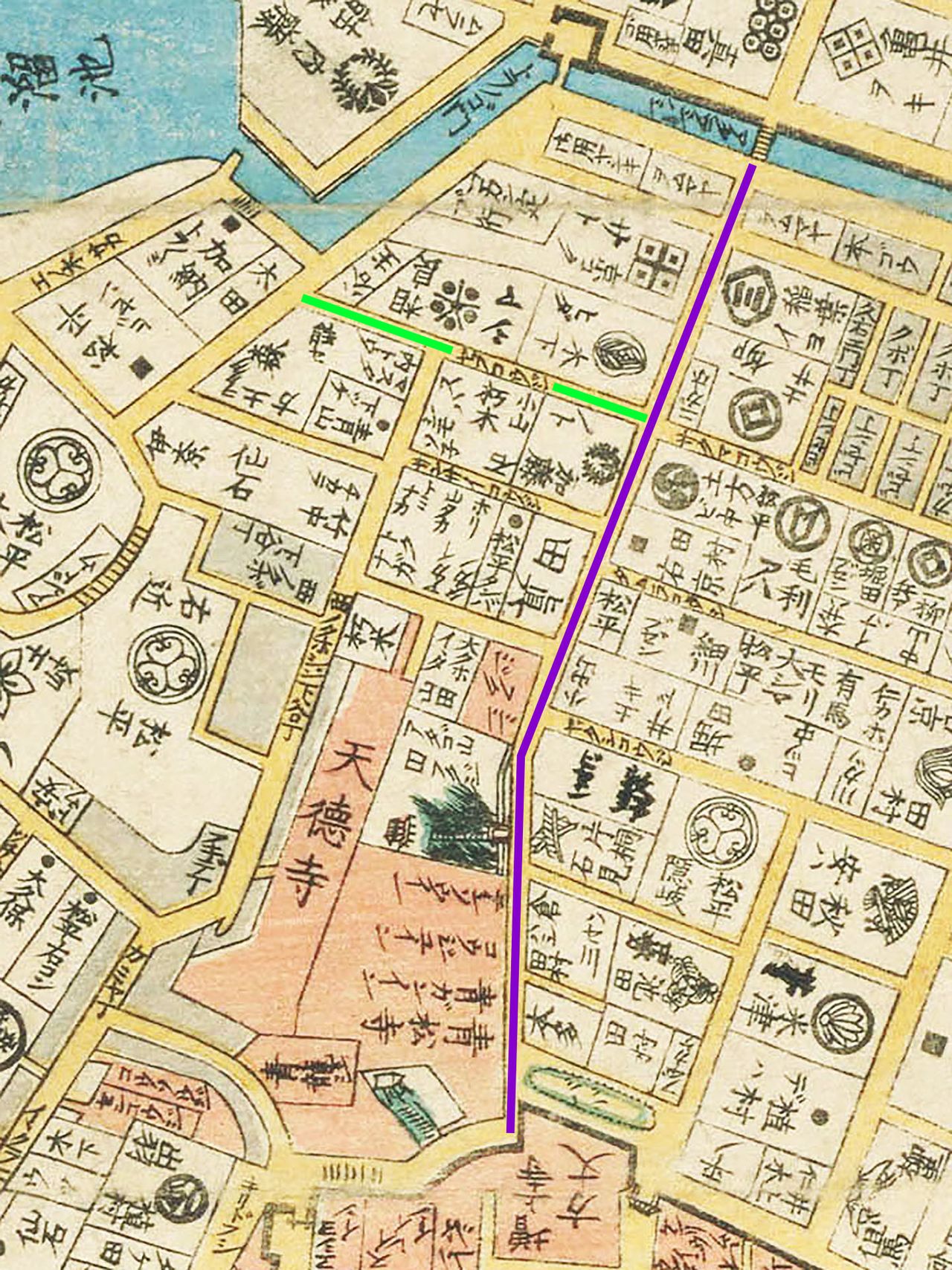 Sección que representa la zona desde Toranogomon hasta el templo Zōjōji en el Gran mapa ilustrado de Edo revisado en la era Ansei (1858, Archivo de la Biblioteca de la Dieta Nacional). La calle Atagoshita está marcada en violeta y Yabukōji, en verde.