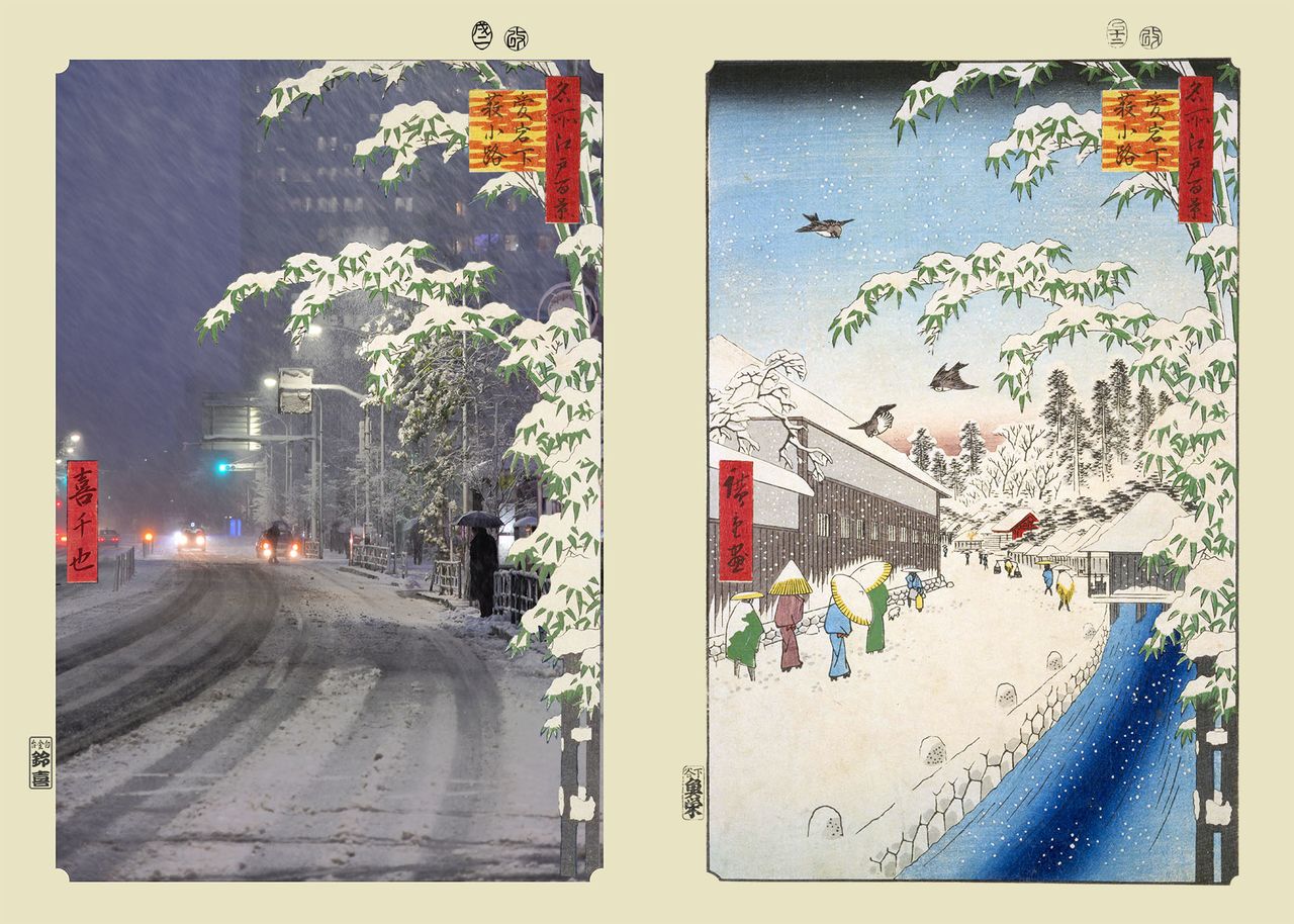 Me dirigí al lugar de la escena un día de enero de 2018 en que cayó una gran nevada. El edificio Toranomon Hills Business Tower estaba en construcción y, al colocar la cámara en el punto donde se situó Hiroshige, las vallas de las obras se llevaban todo el protagonismo. Había mala visibilidad a causa de la nieve, por lo que solo se veía la carretera recta. Bajando un poco en dirección al sur, encontré una curva suave en la calle Atagoshita y el semáforo de Atago-jinja-shita. El arco que trazaban los carriles de la calzada coincidía con la imagen del río Sakuragawa, ahora enterrado, por lo que tomé allí la instantánea.