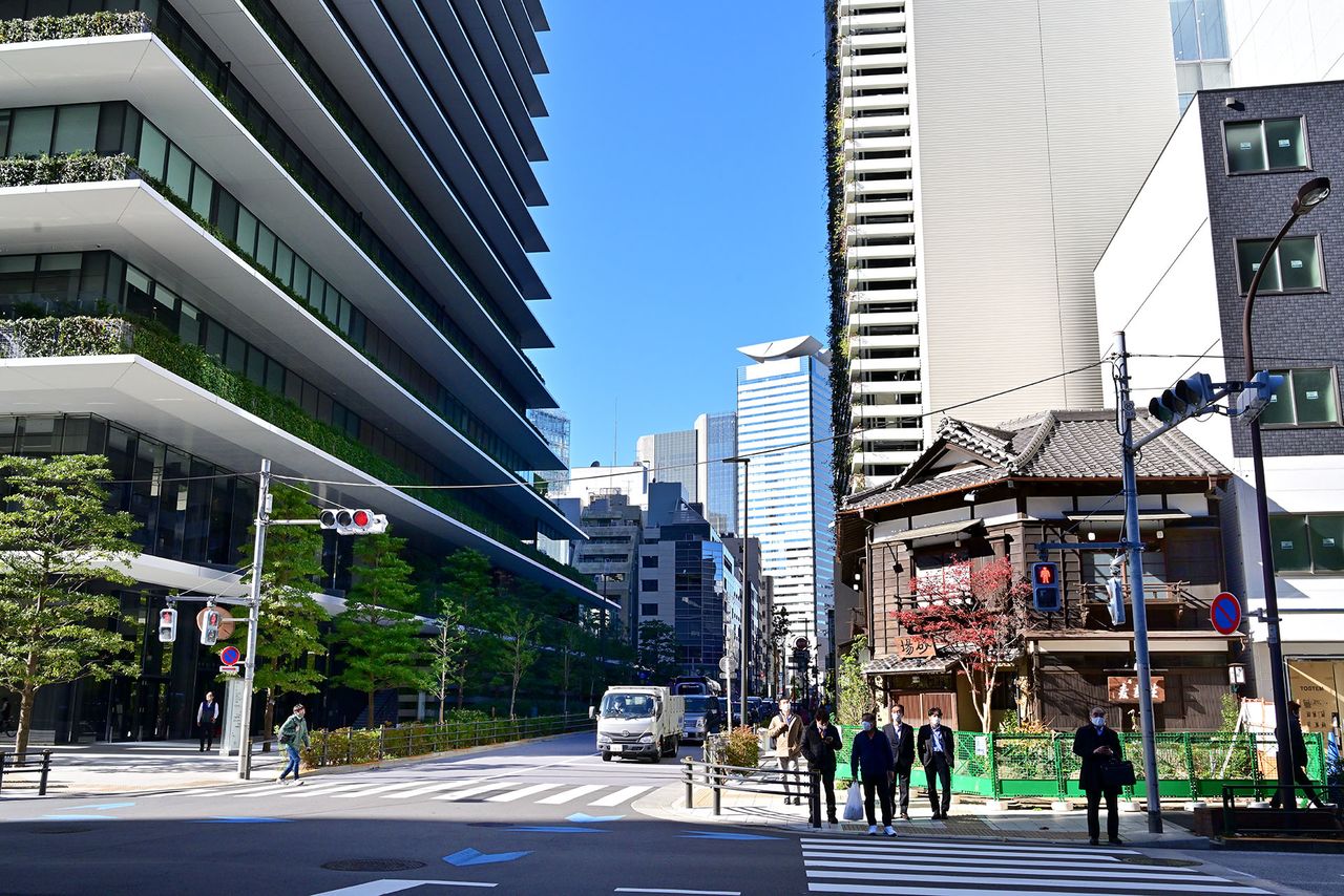 A la izquierda del restaurante de soba Sunaba, que se conserva entre los rascacielos, pasa la calle que antaño se llevaba el nombre de Yabukōji. El bosquecillo de bambú debía de crecer donde ahora están los árboles de la izquierda.