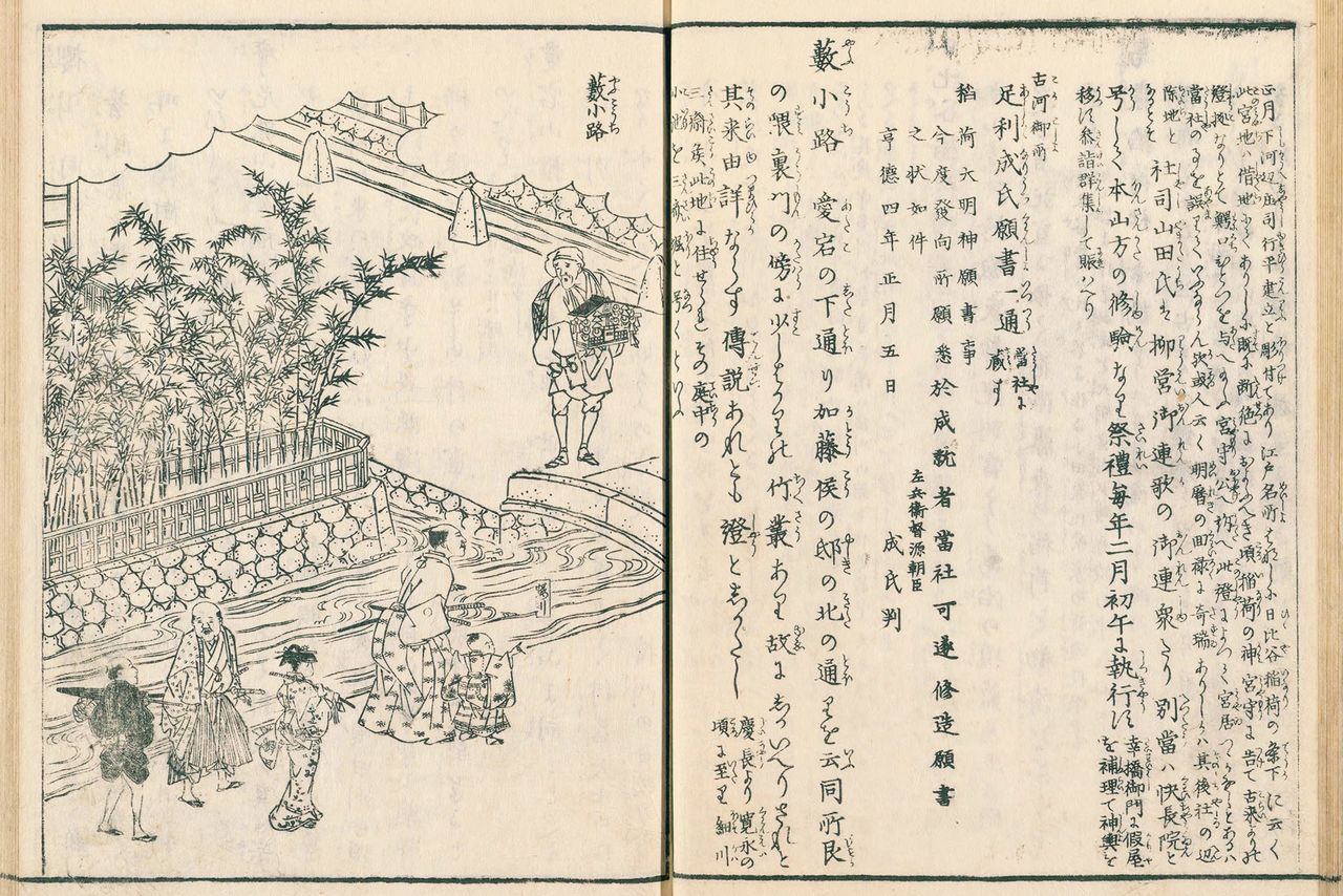 Yabukōji, en el Mapa de lugares famosos de Edo (1834, Archivo de la Biblioteca de la Dieta Nacional). Más que un bosque de bambú, parece un seto. En la explicación se dice que el lugar pasó a llamarse Sakuragawa (‘río de cerezos’) porque, cuando la zona era campo, el río estaba flanqueado por hileras de cerezos.