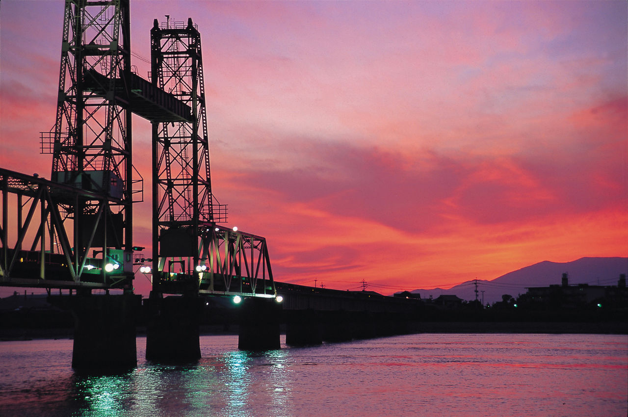 Construido en 1935, este puente de levante fue cerrado en 1987 cuando la línea de ferrocarril que lo cruzaba fue eliminada. Más tarde, no obstante, se le dio una nueva vida como puente peatonal, reabriendo en 1996. La parte movible baja ocho veces al día para permitir el paso entre Morodomi y la ciudad de Ōkawa al otro lado del río en la prefectura de Fukuoka.