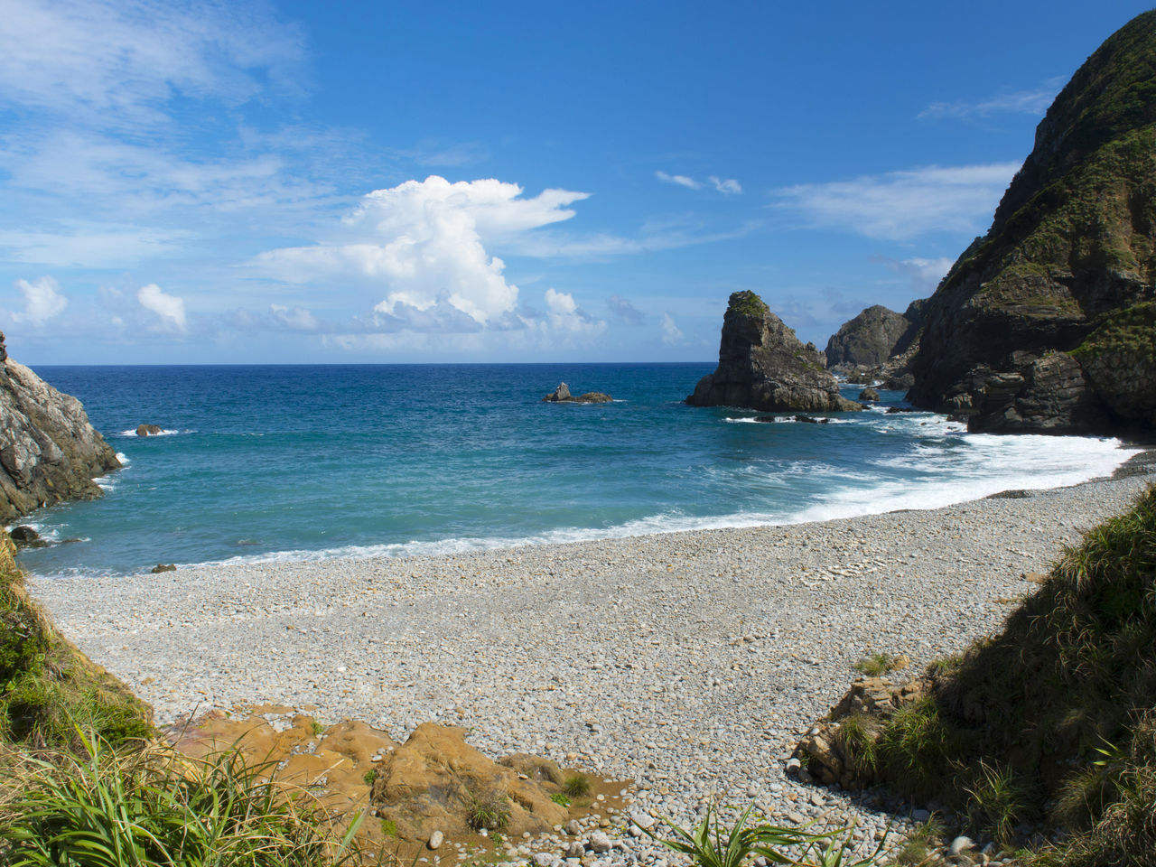 La playa de Yadorihama ofrece un hermoso contraste entre la arena blanca y el azul del mar.