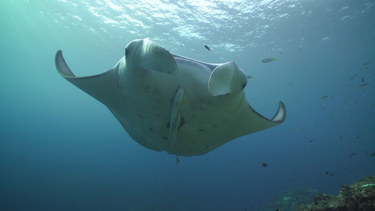 Fotografía del encabezado: Una manta alfredi de arrecife nada calmadamente en el mar de Okinawa. ©OCVB