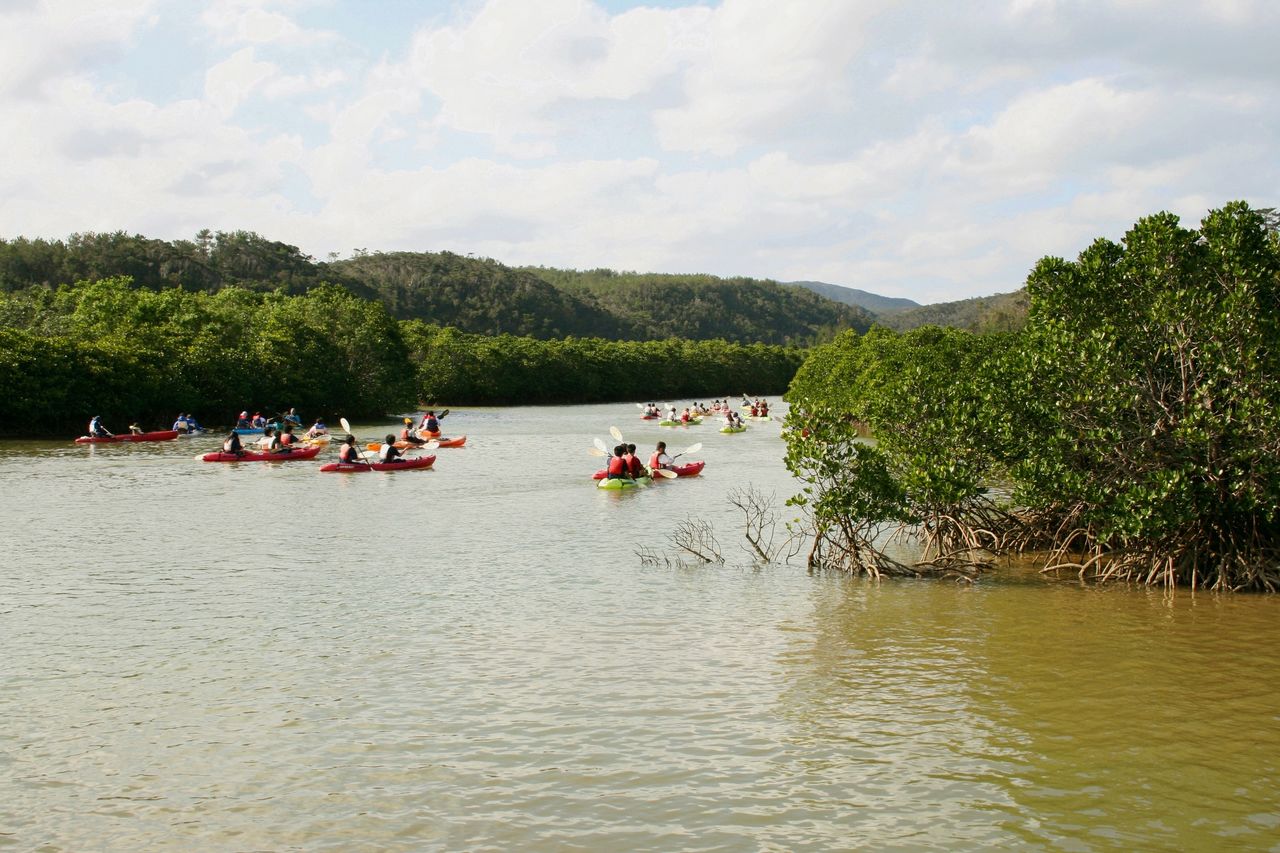 Turismo en kayak a través del bosque Hirugi, que se extiende por cerca de 1 km desde la bahía de Gesashi. ©OCVB.