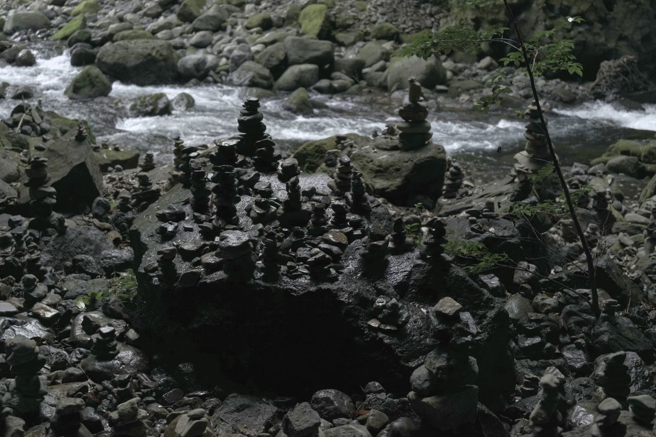 Montoncitos de piedra dentro de la cueva. Fotografía: Ōsaka Hiroshi.