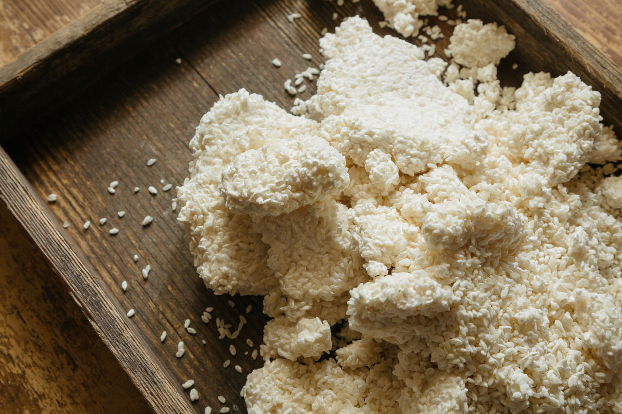 El kōji, indispensable en la fermentación, se reproduce a partir del kōji-kin —un tipo de moho propio de Japón— cuando se cuece al vapor, arroz, trigo u otros cereales.