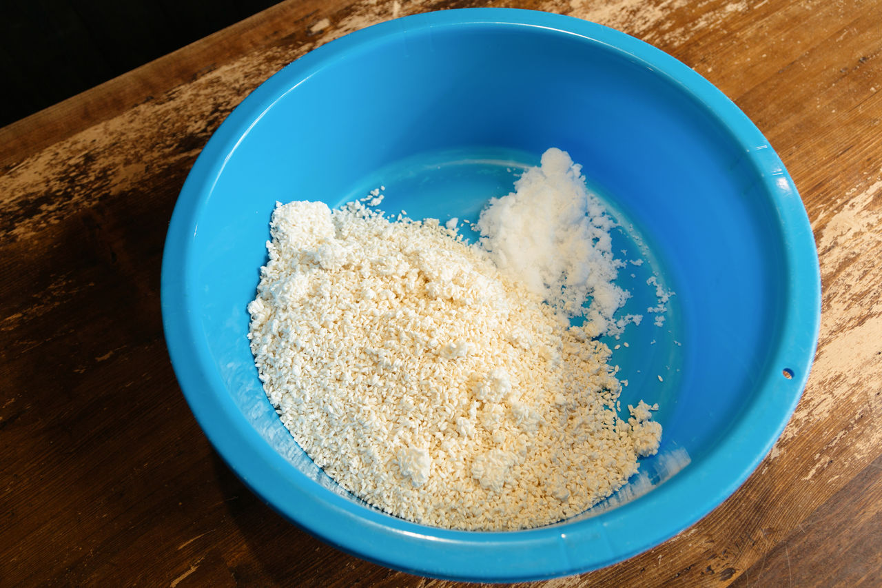 A continuación, se ponen el kōji y la sal —entre un 10 % y un 13 % de la cantidad total de los tres ingredientes— en un barreño o tina de gran tamaño y se mezclan suavemente con la mano.