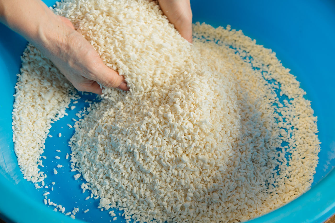 Kōji elaborado a partir del moho que se reproduce en el arroz cocido al vapor. Si miramos la fotografía atentamente, veremos que la superficie del arroz está cubierta de unas hifas blancas de textura esponjosa.