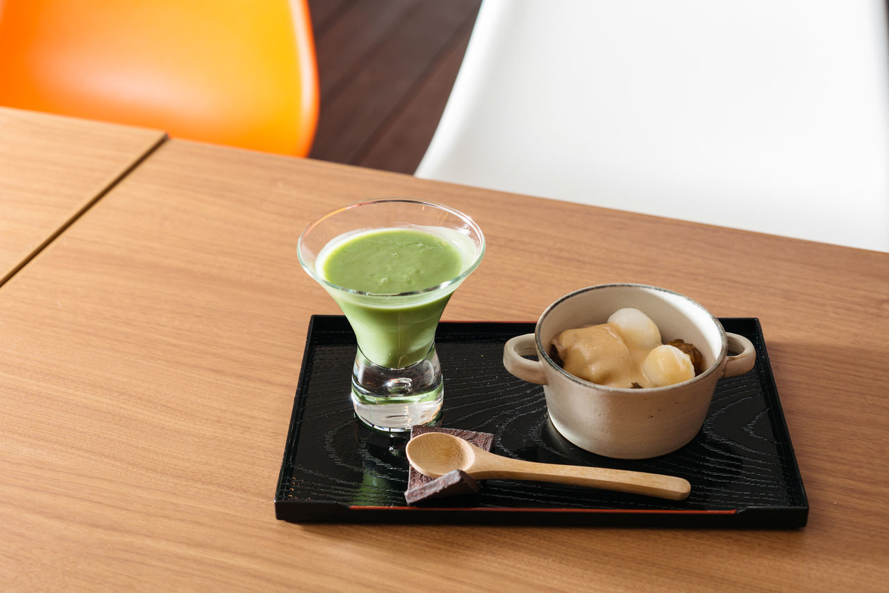 Bolitas de amazake similares al postre anmitsu y bebida con kōji y té verde en polvo. Si se piden ambos juntos, cuestan 864 yenes.