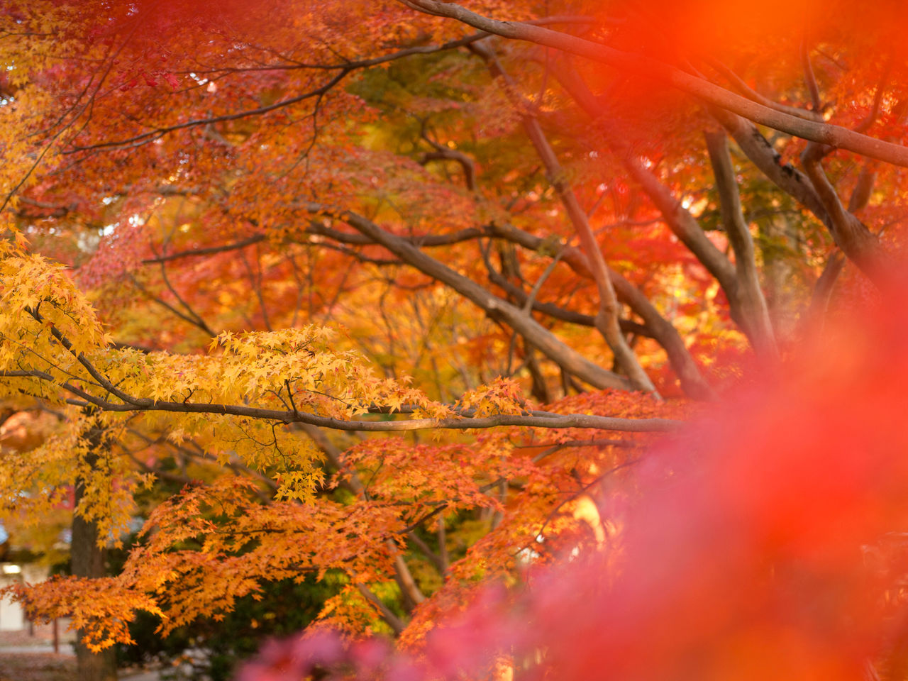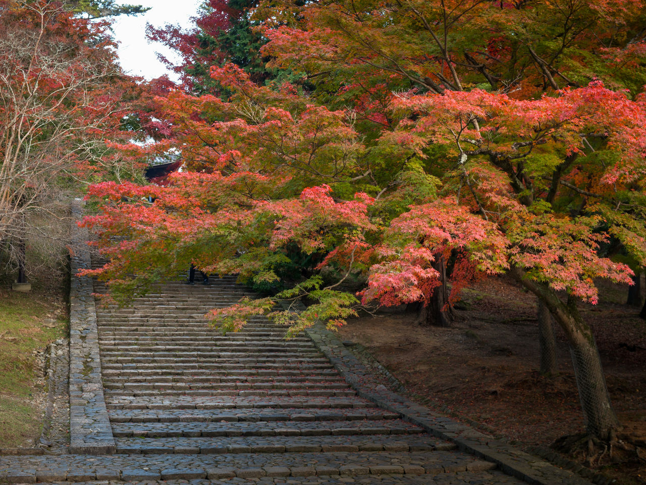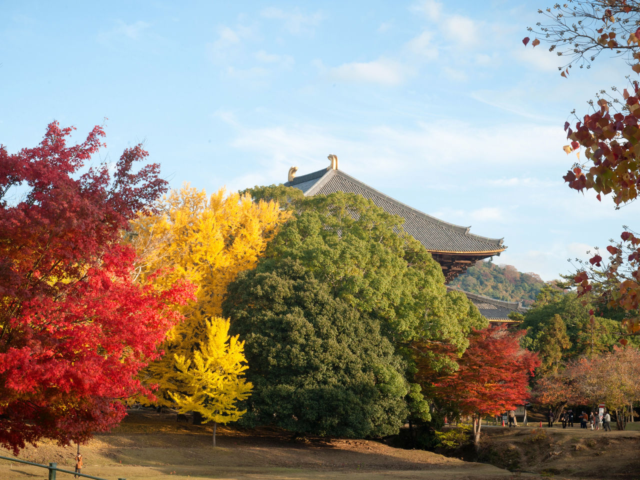 También podrá disfrutar de los arces otoñales en la parte este del pabellón del Gran Buda, donde se encuentra una escalera que lo llevará al campanario, tesoro nacional de Japón. Un poco más arriba está la zona Jōin, donde, desde antes de la construcción del Tōdaiji, se dice que ya existían santuarios y templos. El Nigatsudō, famoso por el festival sagrado del agua Omizutori, se encuentra en un terreno en pendiente y desde su escenario se puede disfrutar de una vista panorámica de Nara. El Sangatsudō, como se conoce coloquialmente al pabellón Hokkedō, es la edificación más antigua del Tōdaiji y, según la tradición budista, ahí se encuentran los restos del templo Kinshōji, el origen del Tōdaiji. Toda la historia que encierran estas edificaciones hace de este paisaje otoñal algo todavía más atractivo.