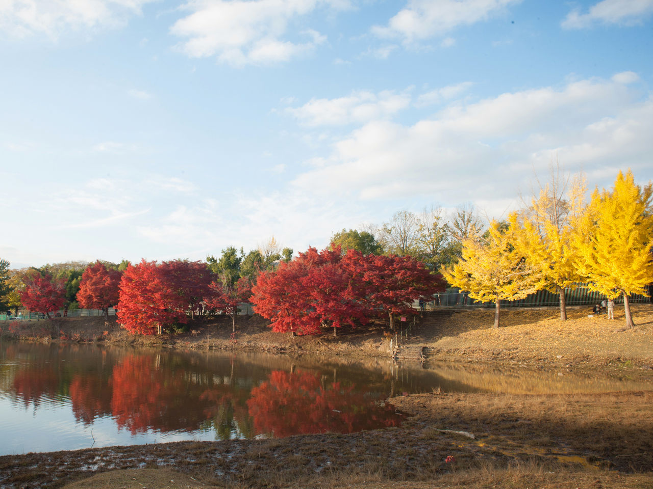 Los alrededores del pabellón del Gran Buda suelen estar colmados de turistas, pero si se dirige un poco más al noroeste, con dirección al estanque del Gran Buda, podrá disfrutar en un entorno sereno del hermoso follaje otoñal. Los árboles a las orillas del estanque se tiñen de rojo y amarillo durante el otoño y, con su follaje, dan color al solemne del pabellón del Gran Buda.