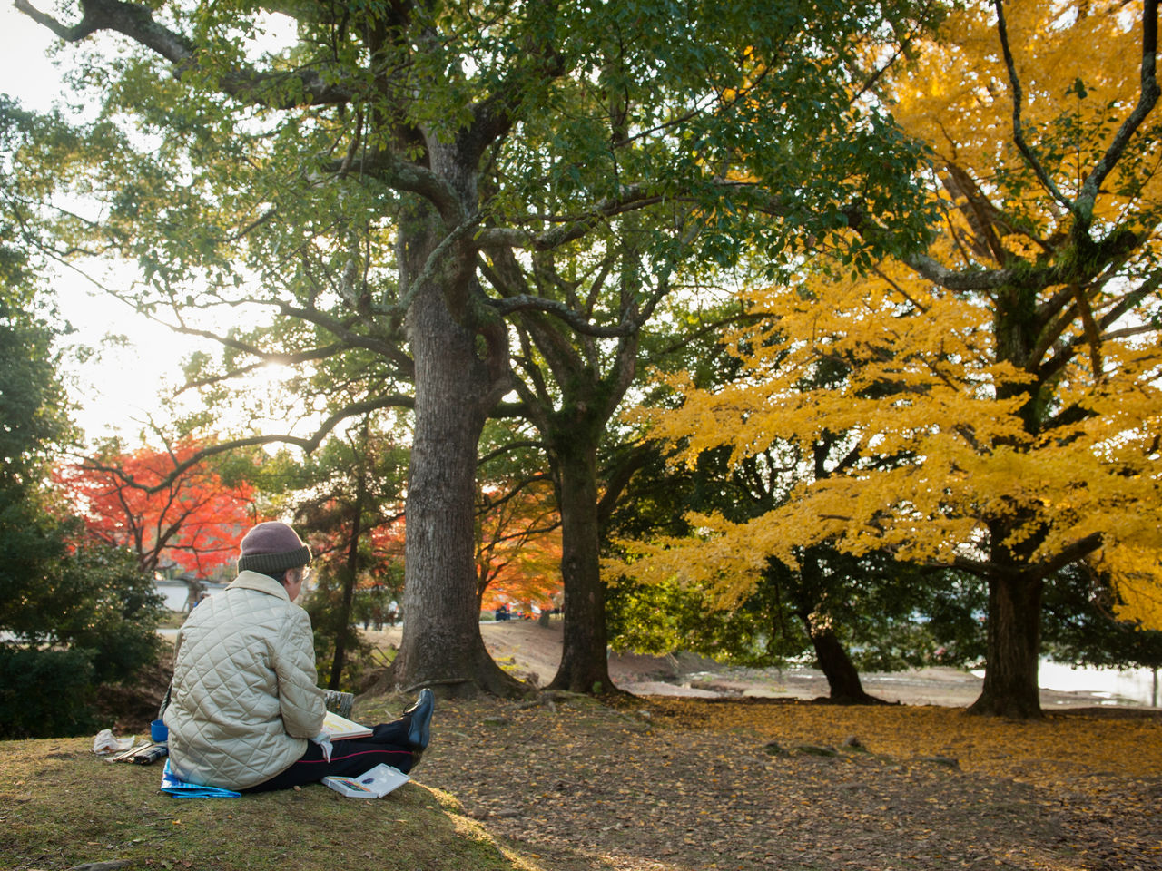 Una persona pintando un ginkgo que ha cambiado de color. El parque de Nara también es un lugar de relajación para los ciudadanos de la zona.