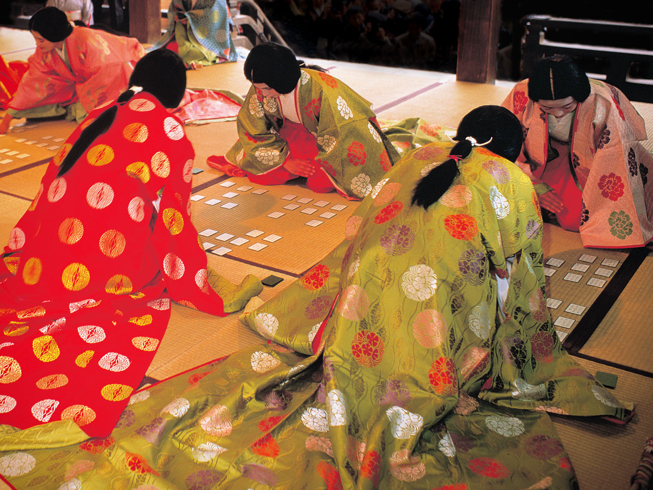 El 3 de enero se celebra el primer juego de cartas del año en el santuario de Yasaka (distrito de Higashiyama) en honor a Susanoo-no-mikoto, el dios de las tormentas venerado en el lugar y considerado el primer poeta en componer versos en un estilo propiamente japonés (waka). En el escenario del teatro noh del santuario, mujeres y niños vestidos con ropas de la época Heian juegan el juego de cartas Hyakunin isshu (Cien poetas, cien poemas). Al estar prohibida la técnica de competición de encontrar la tarjeta deseada y hacerla volar con el dorso de una mano, el espectáculo de los participantes poniendo delicadamente sus manos sobre la tarjeta codiciada destila elegancia.