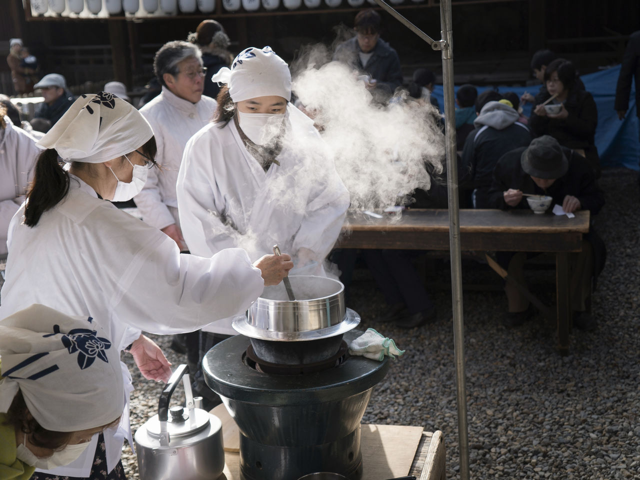 En el recinto del santuario de Gokōnomiya se sirven gachas de arroz con siete hierbas que, según se dice, alejan a los malos espíritus y eliminan todas las enfermedades.