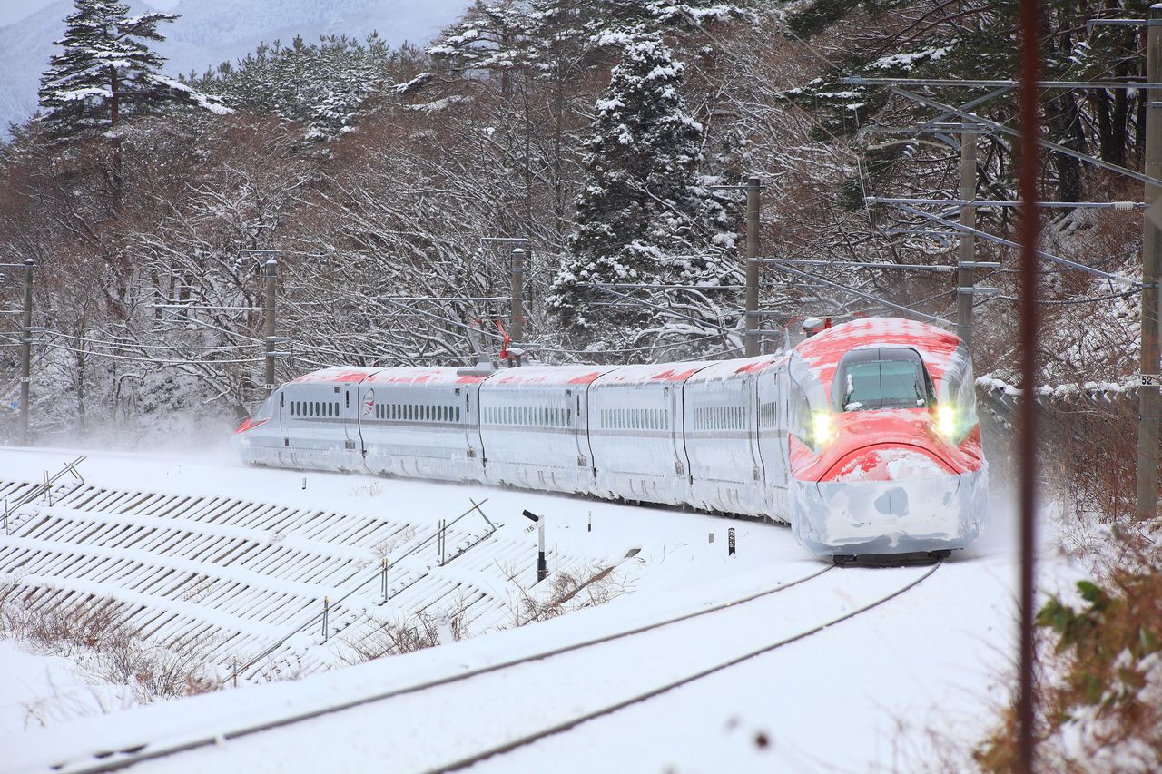 Los inviernos de la prefectura de Akita son gélidos. El tren bala Komachi, de la línea Akita, circula a toda velocidad entre la nieve. Imagen cortesía de la Federación de Turismo de Akita.
