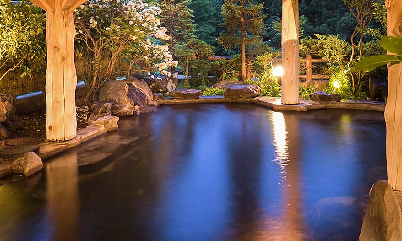 El baño al aire libre de Kōyōkan se ilumina por la noche y se convierte en un espacio fantástico. Fotografía cortesía de Hanamaki Onsen Co., Ltd.