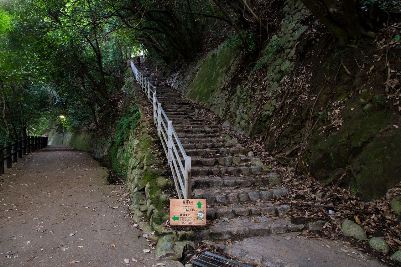 La escalera empinada de la derecha es un atajo para llegar a la cascada Ontaki. El camino de la izquierda lleva al mismo lugar, pasando por la cascada Mentaki.
