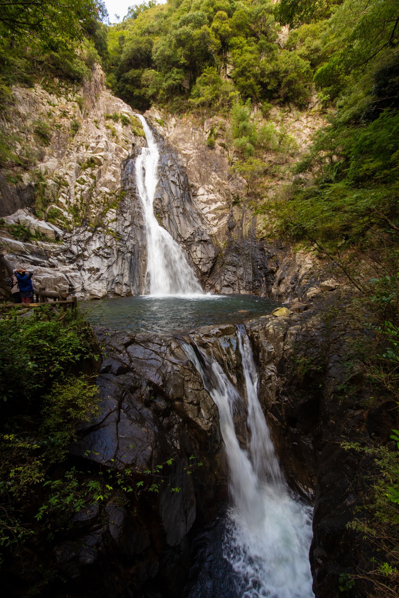 La caída elegante de la parte superior es la cascada Ontaki, de cuya base caen dos corrientes que es la cascada Meotodaki.