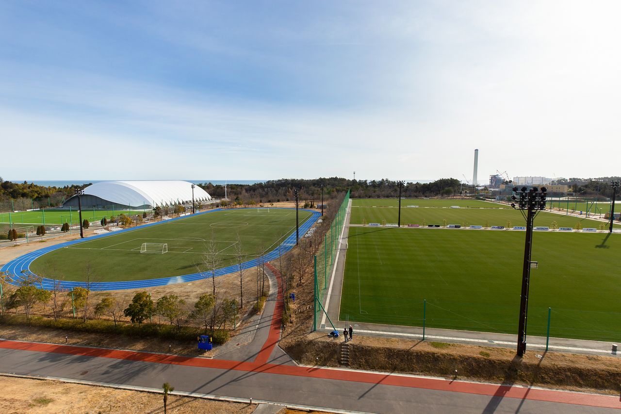 Los campos deportivos del J-Village desde su Edificio Central. Los tres campos que ocupan la mitad derecha de la fotografía son de césped natural. El espacio interior de la pista de atletismo de la izquierda, de césped artificial. Por encima de la carpa puede divisarse, al fondo, el océano Pacífico.