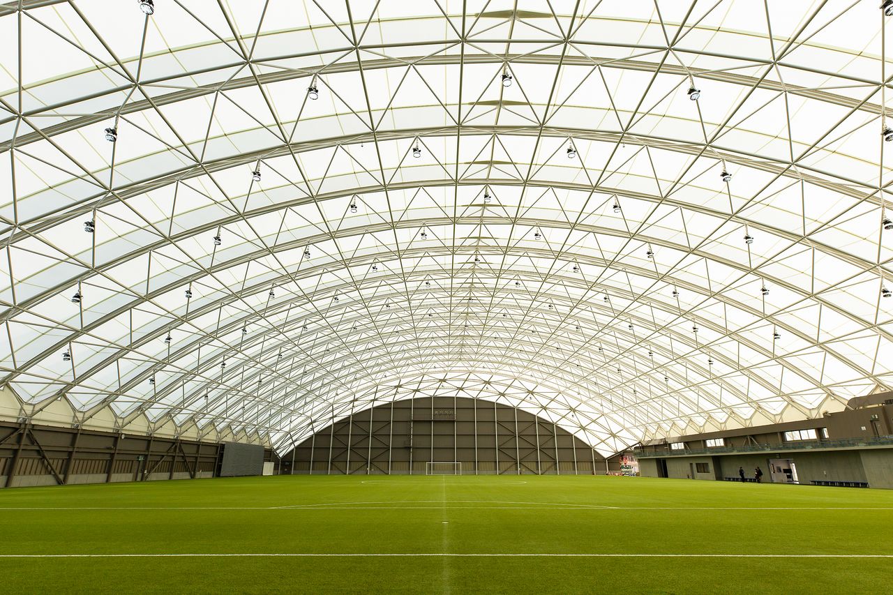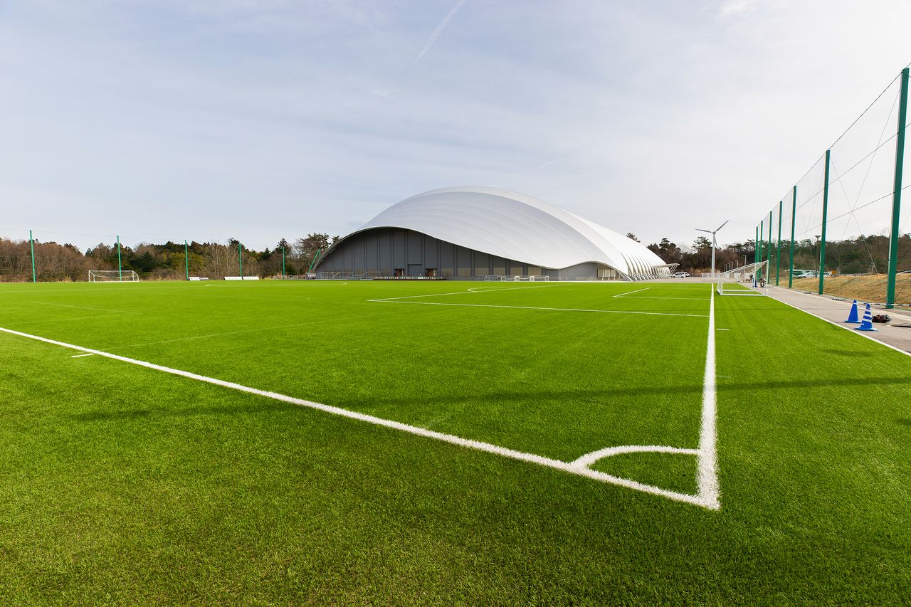 La carpa del campo cubierto está hecha de un material traslúcido que deja pasar la luz solar. El césped es aquí artificial. “En su punto más alto, el techo llega a los 22 metros”, explica Takana, “y eso da mucha libertad para patear alto en los partidos de rugby”. Dos terceras partes de los 2.200 millones de yenes que costó procedieron de las quinielas deportivas (en Japón, “Toto”) y el resto se costeó con donaciones recibidas de todo el país. El J-Village ya disponía de otra instalación semicubierta que podía utilizarse los días de lluvia, pero la nueva es mucho más cómoda pues protege también del frío y del viento, pudiendo ser utilizada en cualquier estación del año o condición atmosférica.