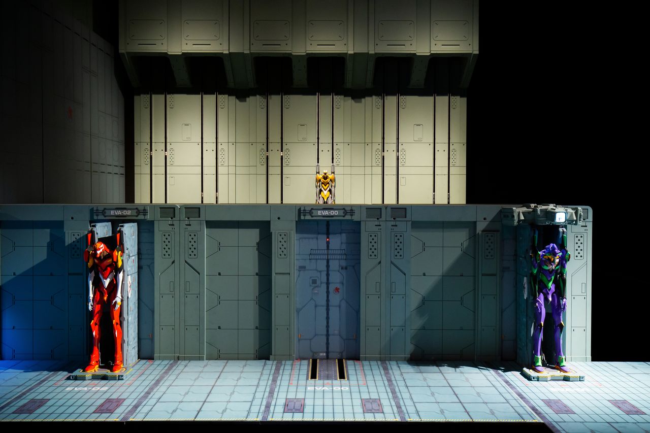 Fotografía del encabezado: las unidades Evangelion alineadas en el Área del Hangar. ©khara