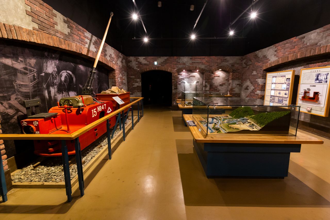 Dentro de la sala de exhibiciones de la mina hay una maqueta de la refinería. A la izquierda hay una vagoneta eléctrica de primera generación.