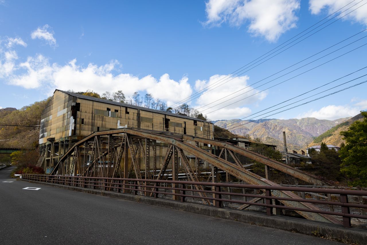 El puente Furukawa, designado bien de importancia cultural de Japón, sobre el río Matsuki, que es la cabecera del río Watarase. Al fondo, las ruinas de la refinería Motoyama.