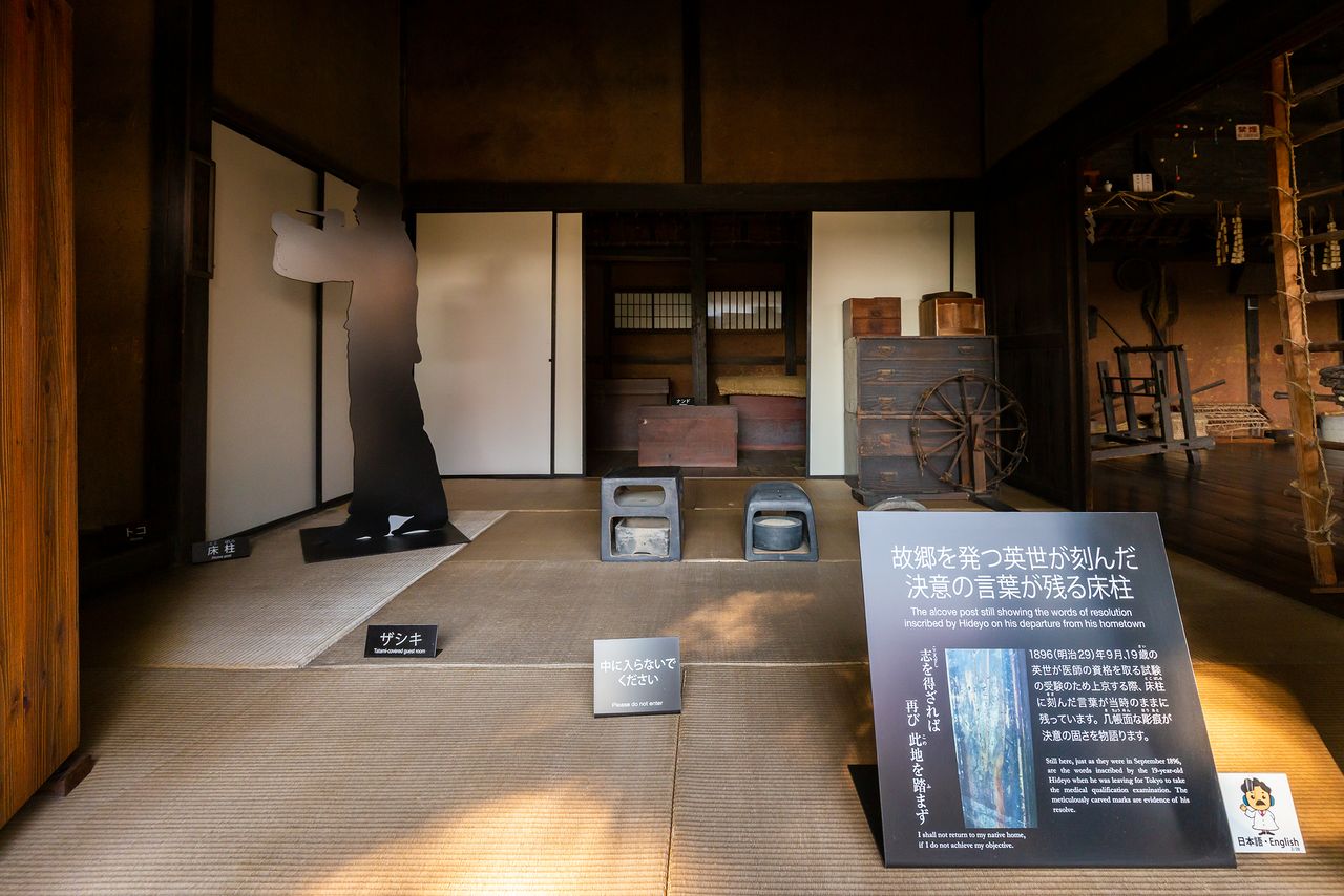 Al entrar en el museo, se recomienda primero visitar la zona de su casa natal. Noguchi Seisaku (más tarde Hideyo) cayó en un irori (un hogar situado en el suelo que se utiliza para cocinar) cuando tenía un año y medio. Los dedos de su mano izquierda se fusionaron, lo que le dificultó sobrevivir como agricultor, un trabajo duro. Hideyo fue educado por su madre, Shika, que le dijo que se ganara la vida como académico.