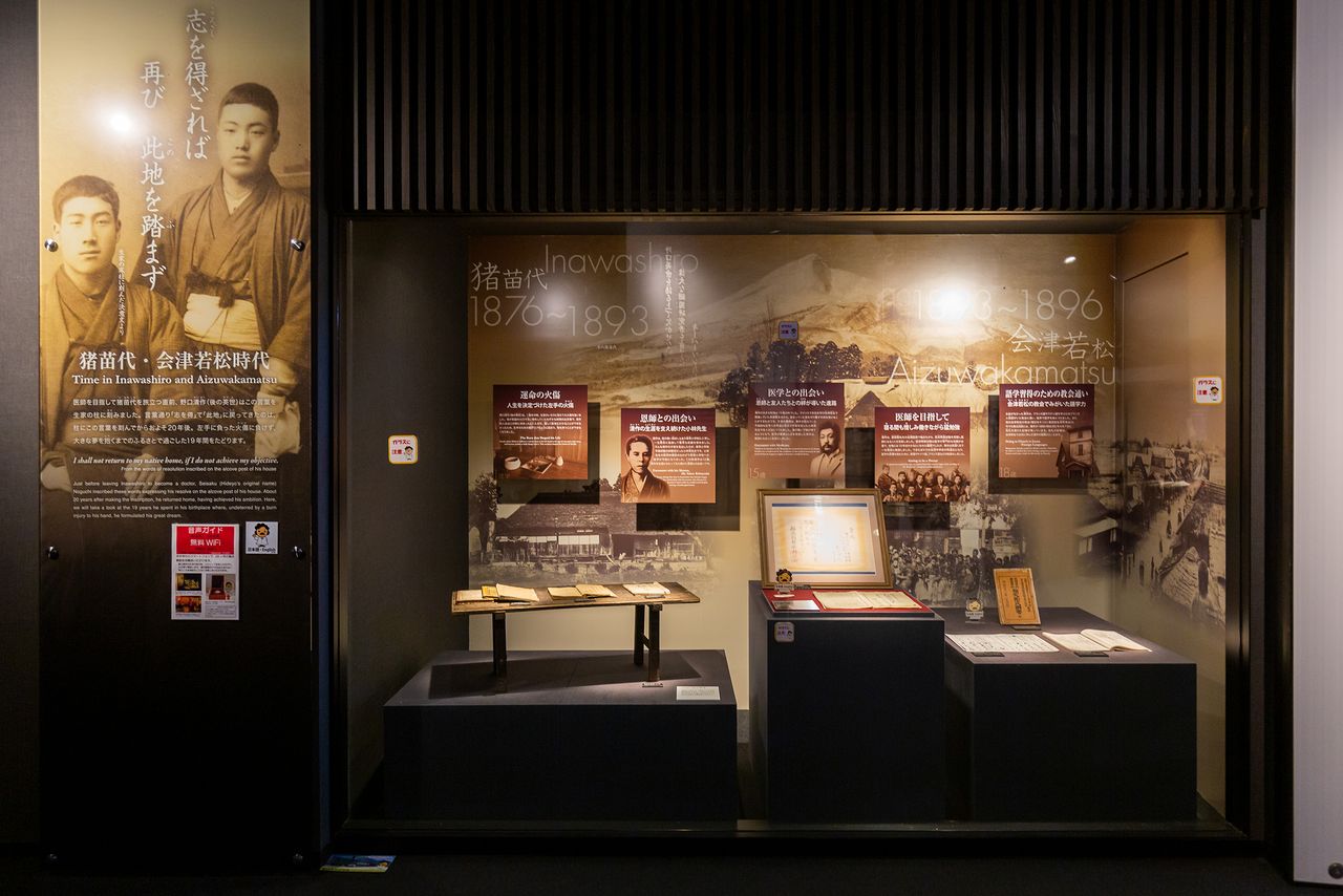 Exposición del periodo Inawashiro y Aizu-Wakamatsu. La gran fotografía de la izquierda fue la primera en la que apareció Noguchi (derecha). Su mano izquierda está cubierta con un paño porque fue tomada inmediatamente después de la cirugía.