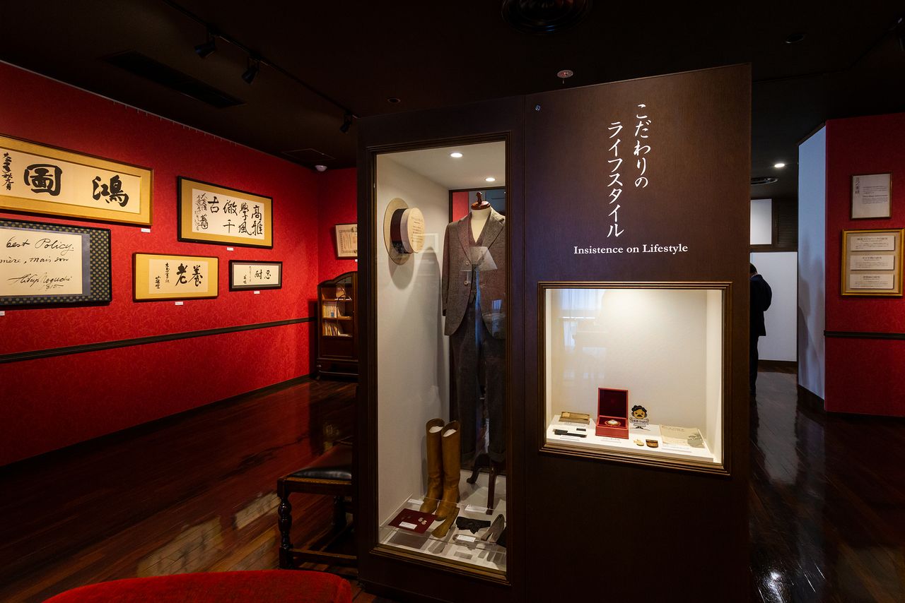 Noguchi, que era muy exigente con su vestimenta, también era un fanático de las novedades y le encantaba utilizar hilo dental. A la izquierda hay caligrafías de su propia mano.