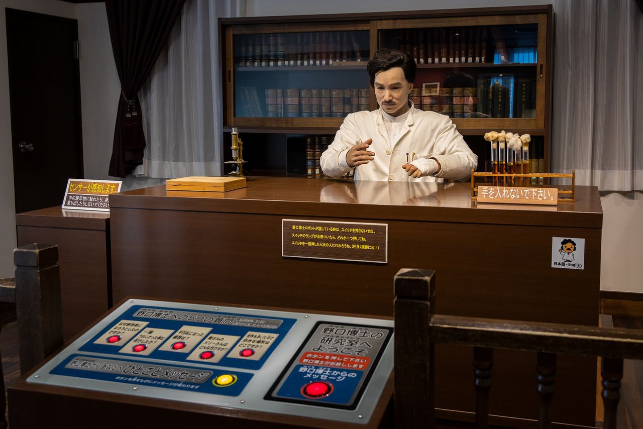Todas las secciones de la exposición del Museo Conmemorativo Noguchi Hideyo están bien diseñadas y los textos con traducción al inglés son fáciles de entender, como dice Morita: “Cuando se renovó el museo en 2015, tratamos de facilitar la comunicación con los estudiantes de cursos superiores de la escuela primaria y los visitantes del extranjero”. En particular, el “Laboratorio del doctor”, donde un robot de Noguchi Hideyo responde a preguntas, es muy popular entre los niños.
