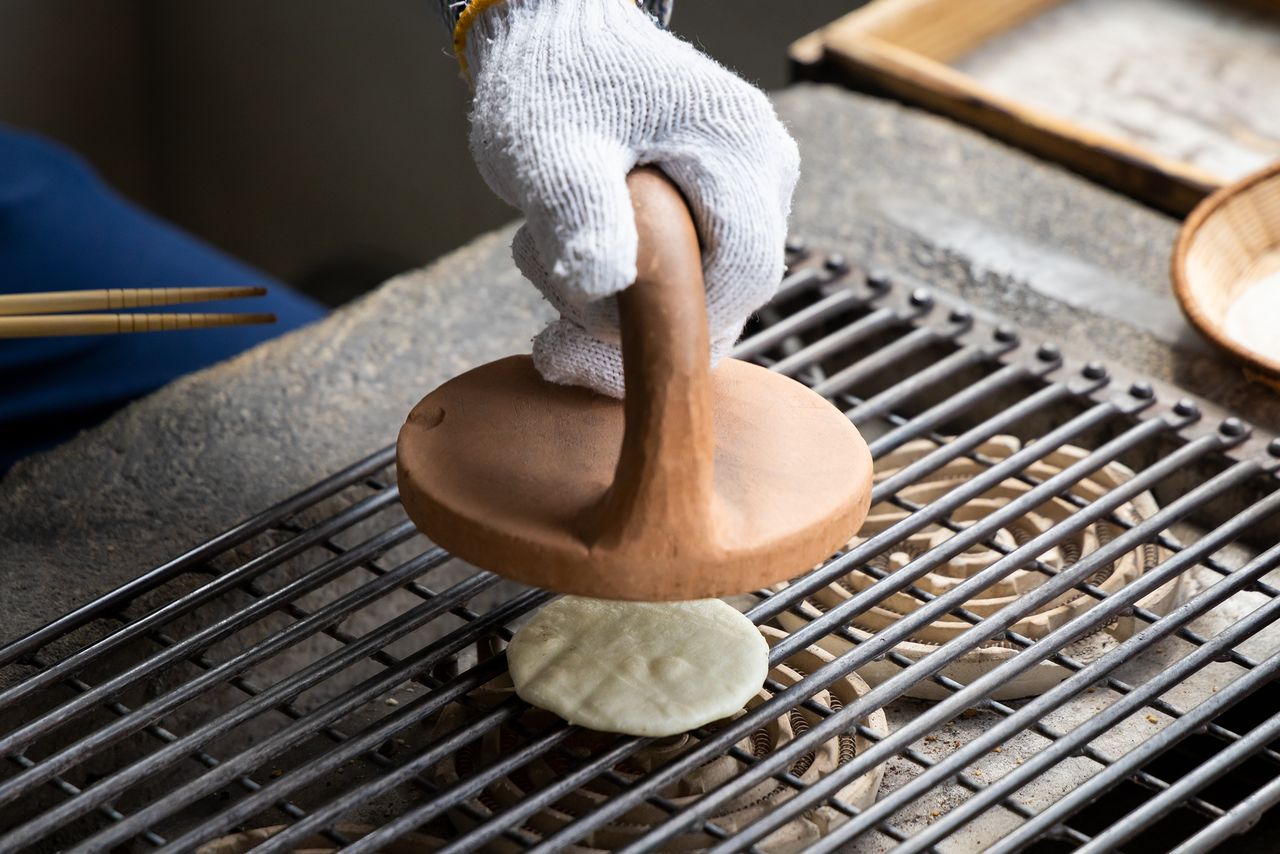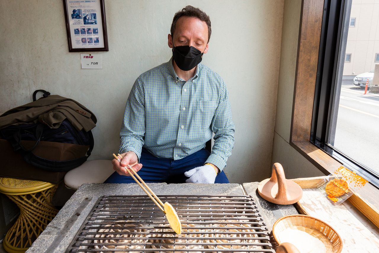 Un miembro de la sección de inglés de nippon.com asando su propia senbei. Voltear la galleta cada tres segundos es una tarea bastante ardua.