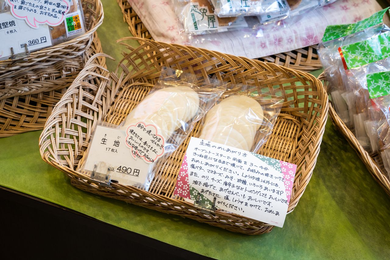 También se puede comprar masa para llevar. Después de hornearla en el tostador, se le puede poner salsa de soja, sal, pasta de miso, queso o algas y preparar una senbei al gusto.